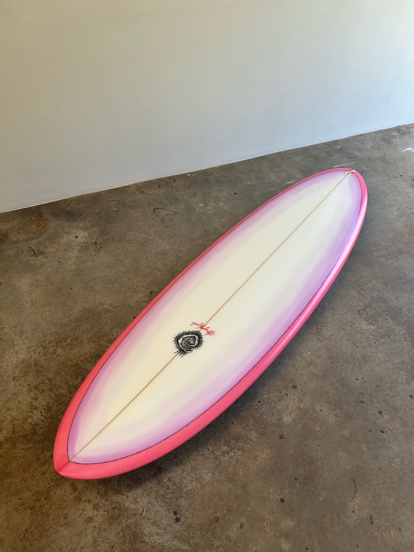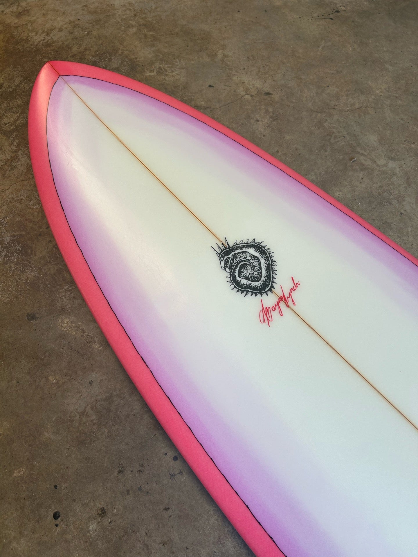 Magenta pink bottom, light purple brushed resin fade deck with 90’s posca sketched pinline . Satin finish